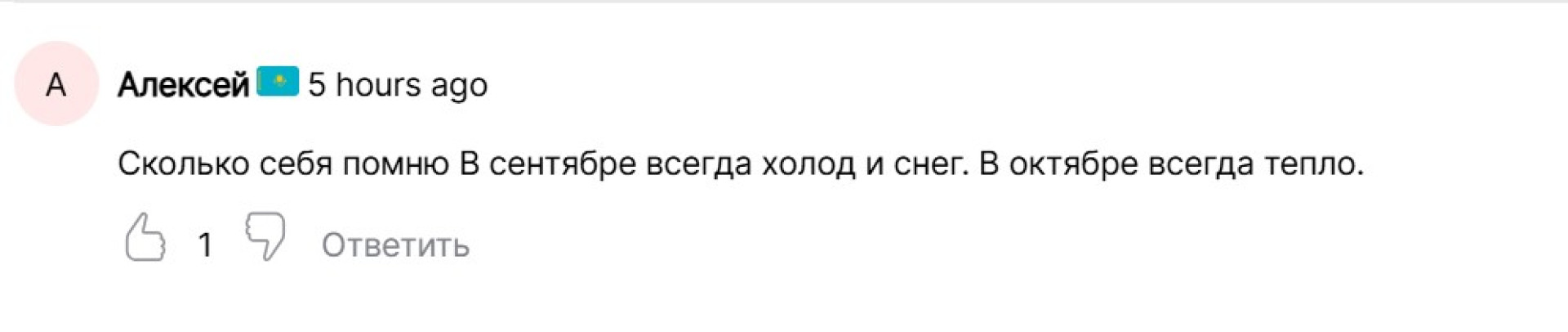 Некоторые из наших читателей, например, жители южных регионов, удивились такой погоде в конце сентября. Другие похвастались теплом. Третьи сказали, что ничего особенного в этом нет: "сентябрь всегда был холодным". А какая погода в вашем регионе? Делитесь в комментариях.