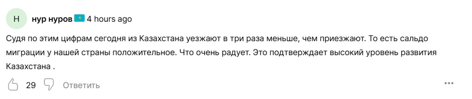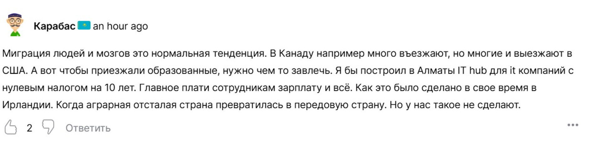 По мнению читателей Tengrinews.kz, из страны уезжают хорошие специалисты, а приезжают "низкоквалифицированные". Но есть и оптимисты, которые считают, что у Казахстана всё хорошо в части миграции. Некоторые казахстанцы буквально дают советы чиновникам, как привлечь образованных специалистов в нашу страну, и приводят в пример Ирландию.