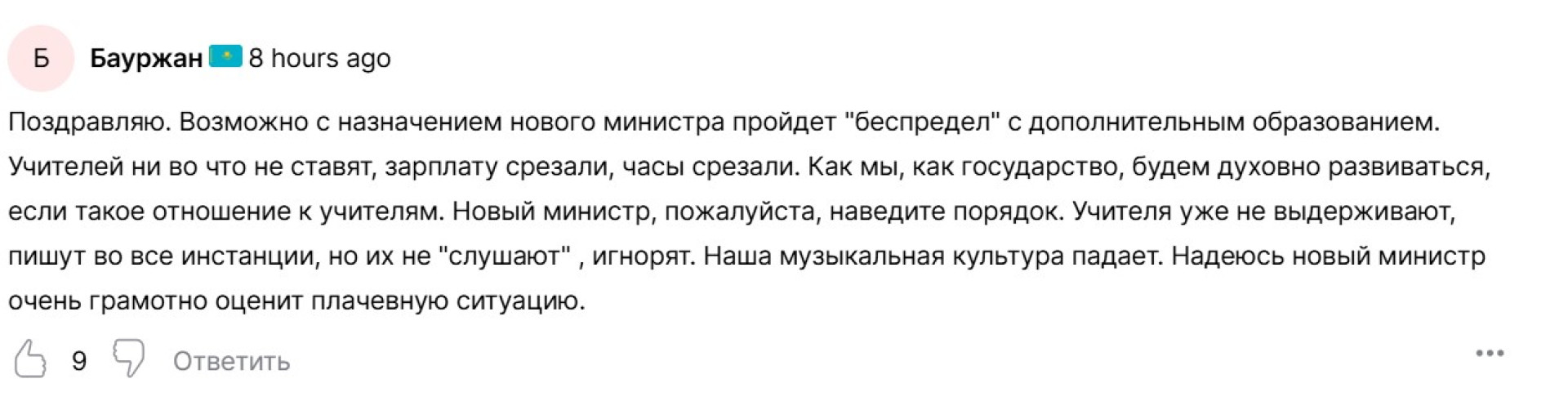 Читатели Tengrinews.kz активно обсуждали новые назначения: одни поздравляли чиновников, другие говорили, что "от перемены мест слагаемых" толку не будет, третьи выражали надежду, что проблемы в указанных сферах наконец разрешатся. Было и немало иронии.