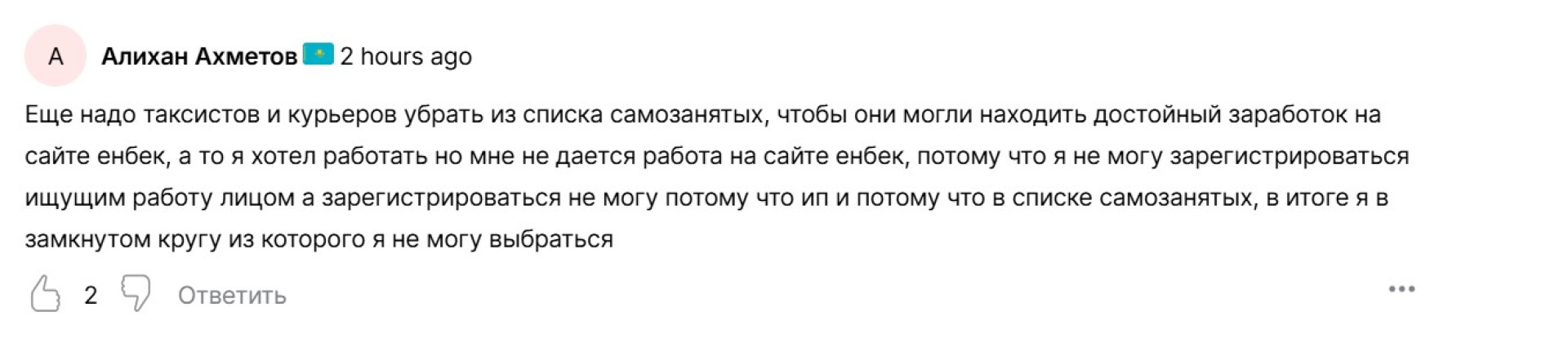 Звучали и мнения о том, что Казахстану пора внедрить отечественную платформу по аналогии с популярными сервисами. Некоторые комментаторы считают, что таксистов и курьеров нужно вовсе исключить из списка самозанятых, другие задаются вопросом, "разрешат ли" им закрыть ИП.