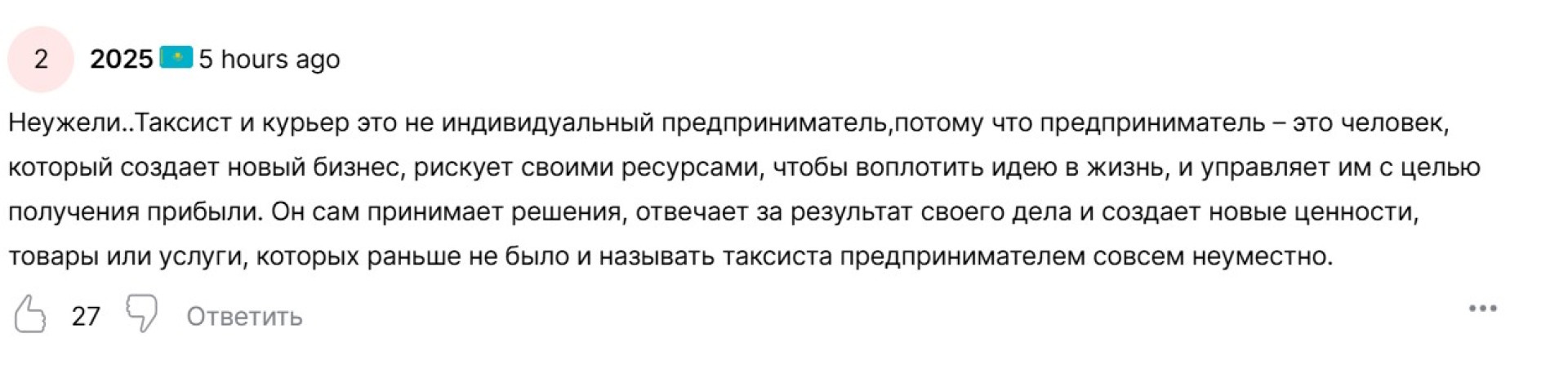 Как отметили читатели Tengrinews.kz, такую норму нужно принять давно, потому что "таксист и курьер - это не индивидуальный предприниматель", ведь они не создают новый бизнес и не "рискуют ресурсами".