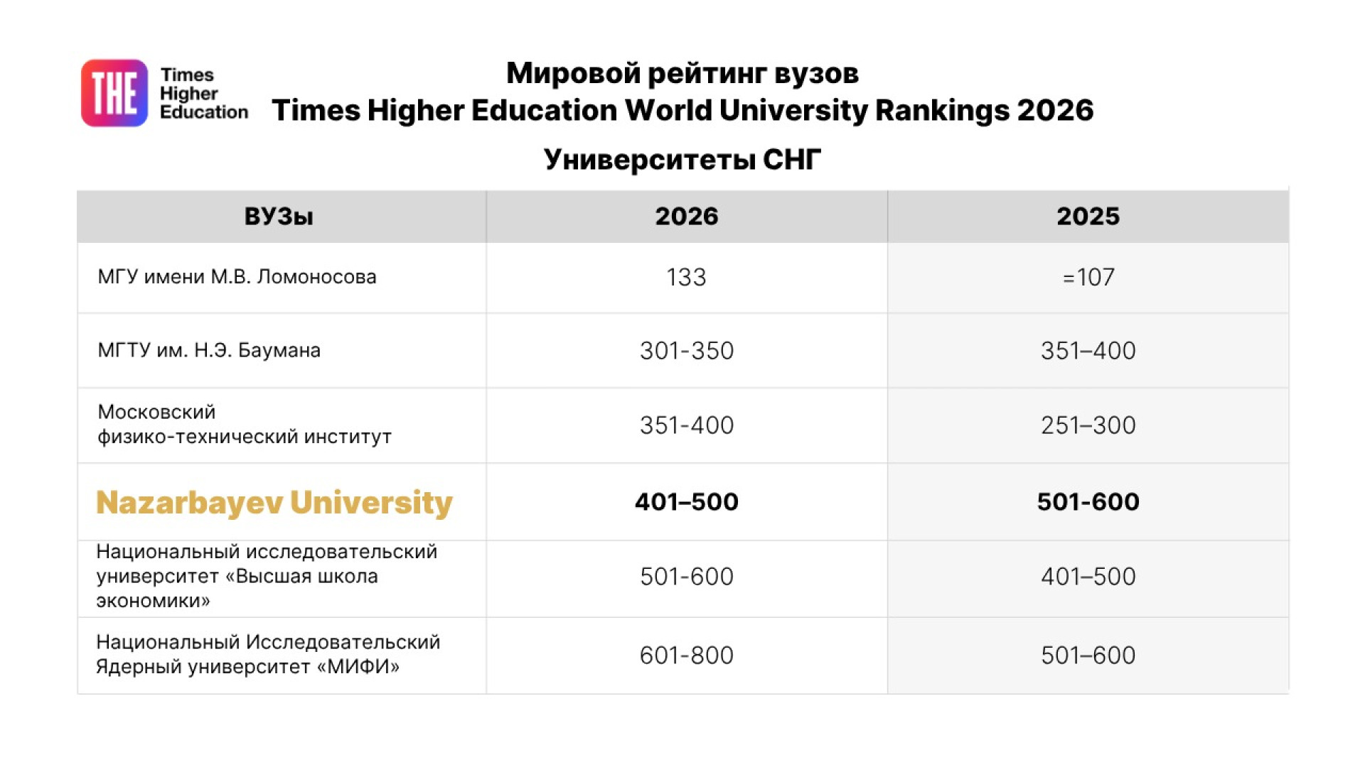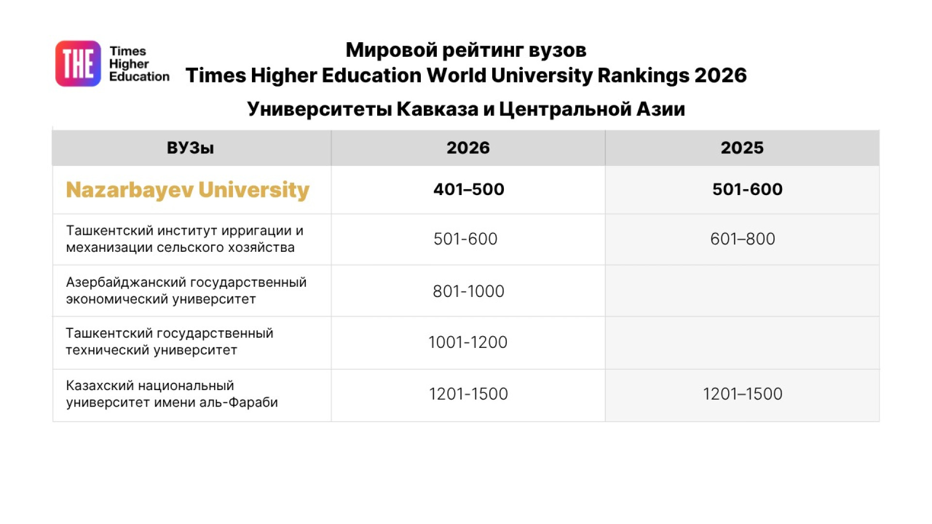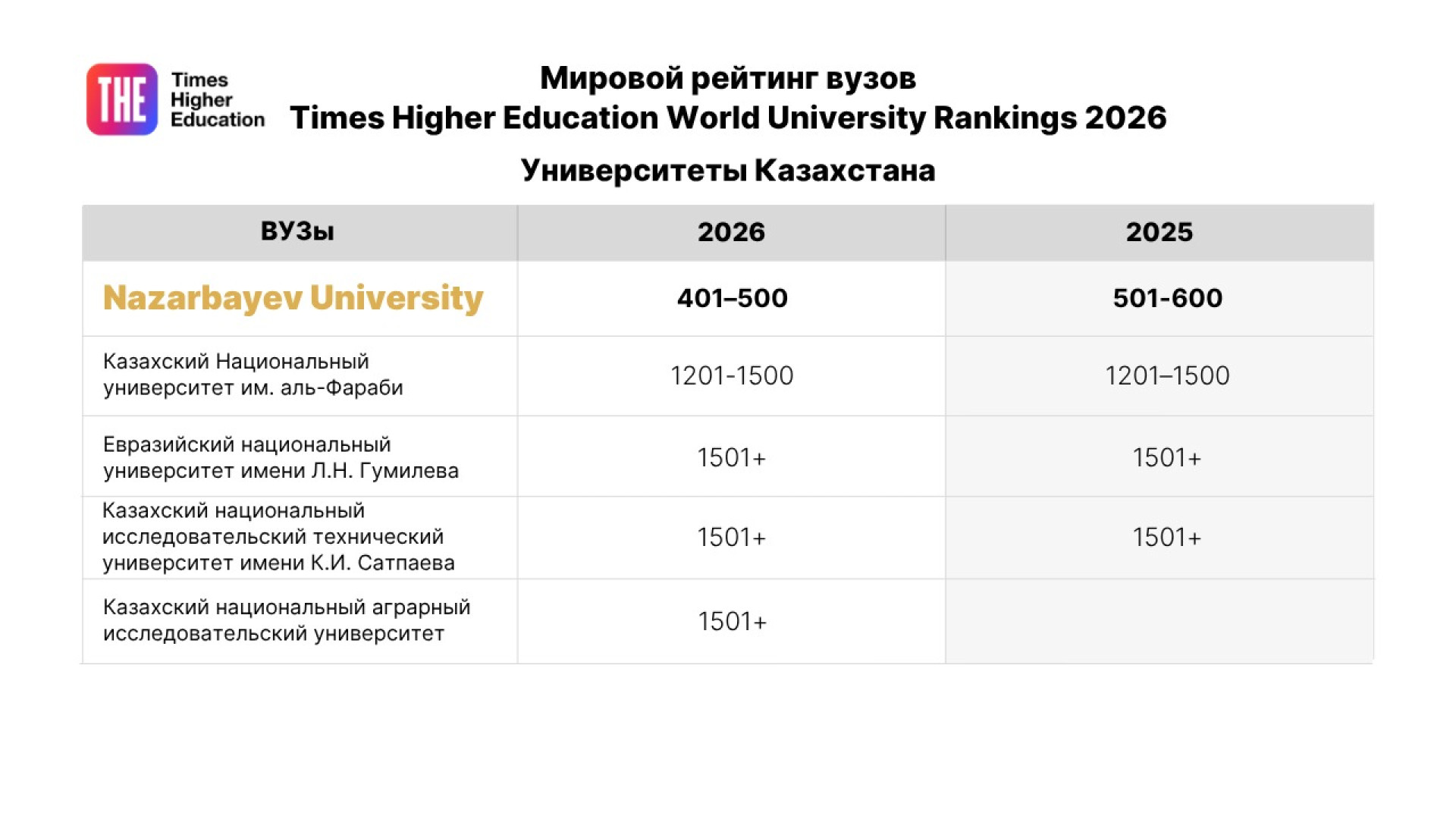 В рейтинге представлено пять казахстанских университетов: Казахский национальный университет имени аль-Фараби (1201-1500), Евразийский национальный университет имени Л.Н. Гумилева (1501+), Satbayev University (1501+), Казахский национальный аграрный исследовательский университет (1501+) и, конечно же, Назарбаев Университет.