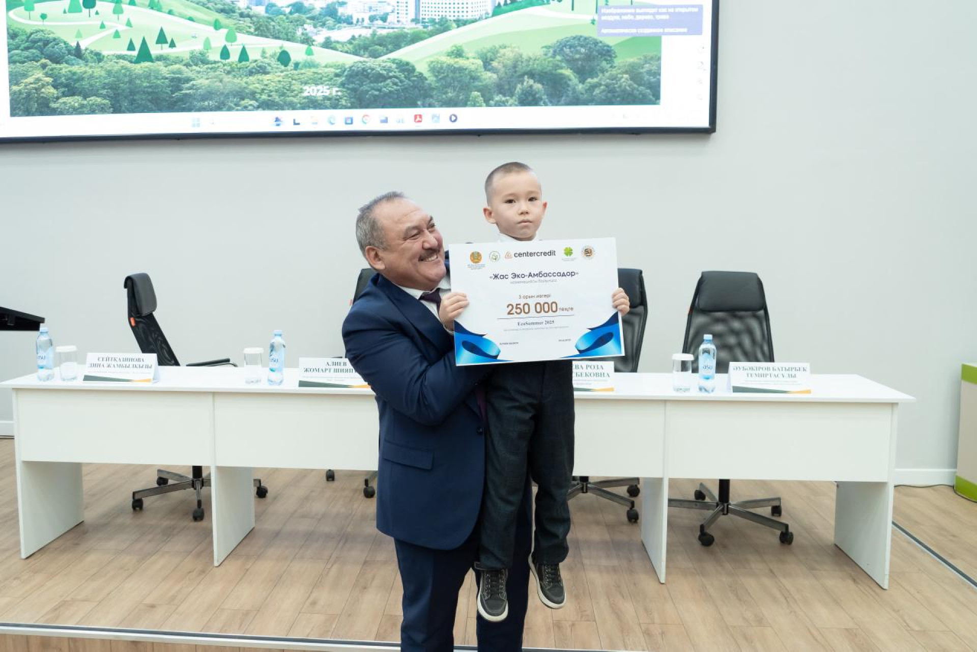 В награждении принимали участие: вице-министр экологии и природных ресурсов РК Жомарт Алиев, председатель правления АО "Жасыл даму" Ержан Сәрсенбай, директор филиала Банка ЦентрКредит Дина Сейтказинова, проректор по академическим вопросам Роза Абишева и председатель Ассоциации переработчиков вторичного сырья Батырбек Аубакиров.