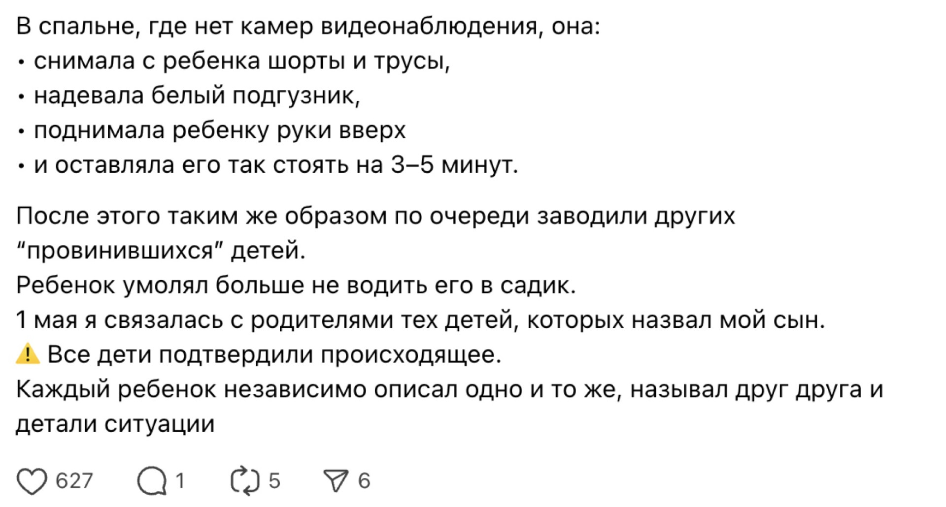 Альмира, мать пострадавшего ребёнка, поделилась своими переживаниями в социальной сети Threads. По её словам, воспитательница применяла наказания в спальне, где отсутствуют камеры наблюдения.