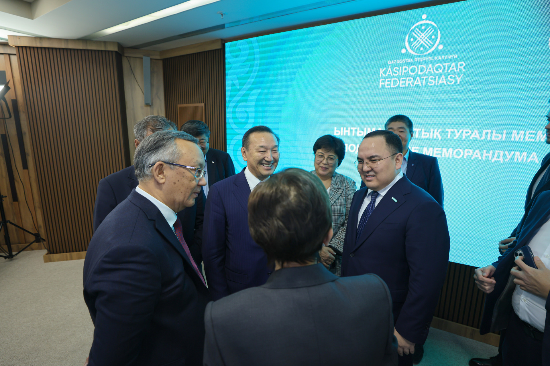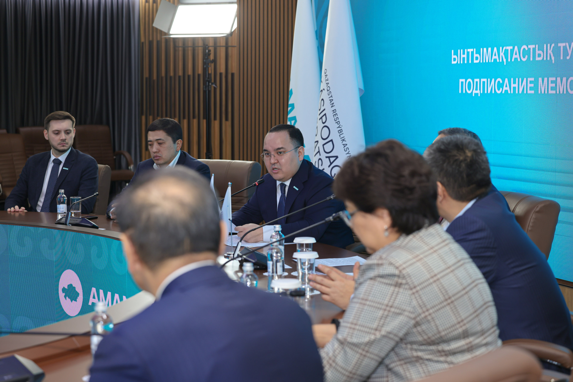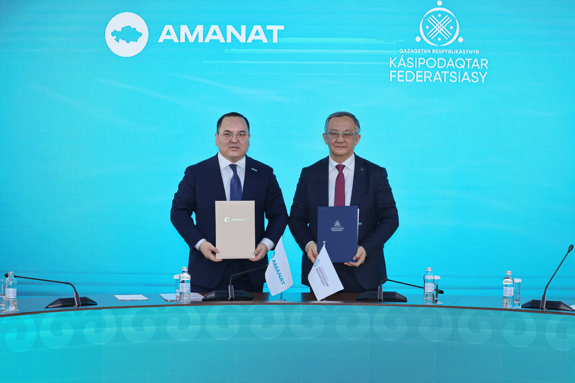 Церемония подписания прошла с участием исполнительного секретаря партии Amanat Дәулета Кәрібека и председателя Федерации профсоюзов Республики Казахстан Сатыбалды Даулеталина.