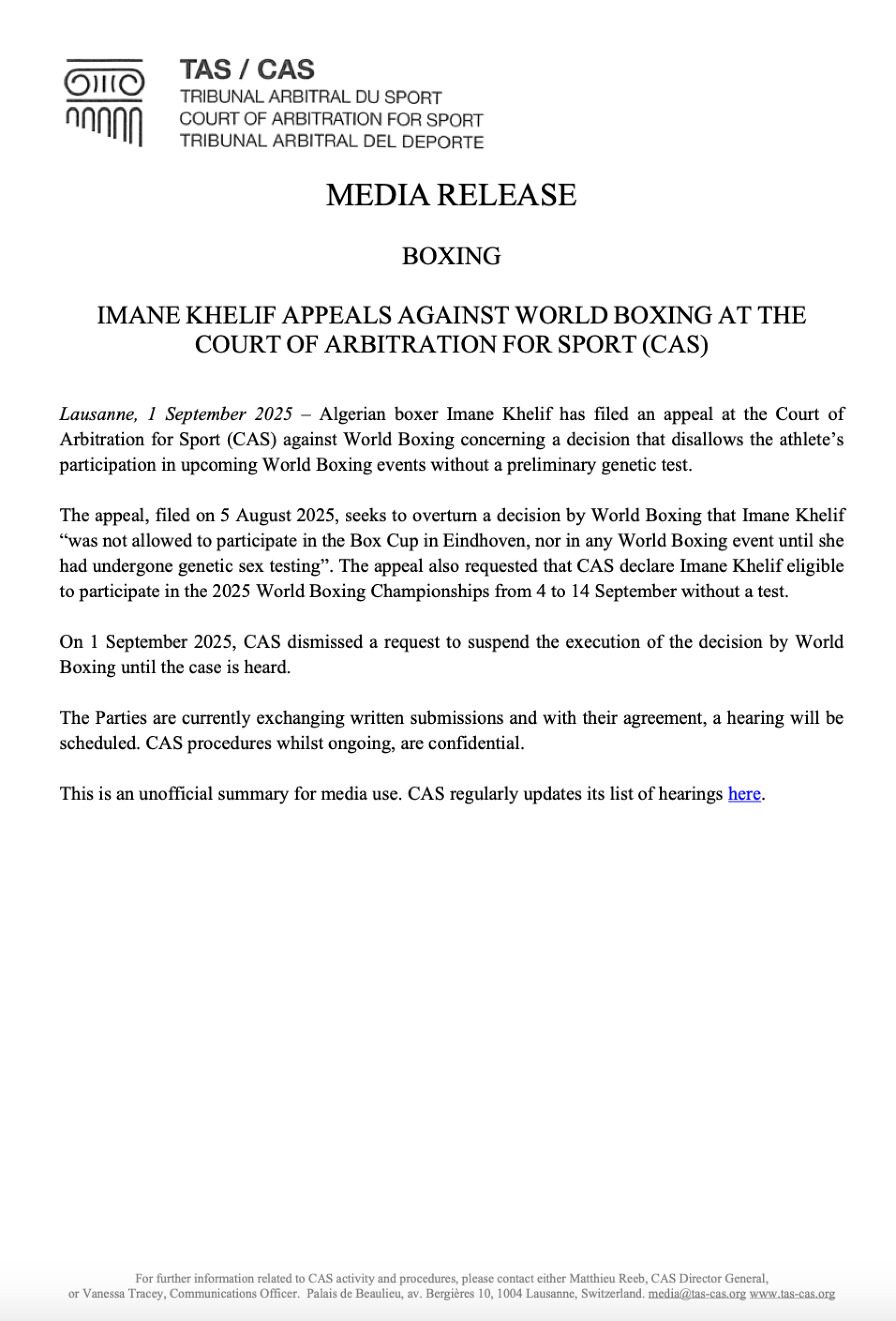 5 августа 2025 года Хелиф подала апелляцию, в которой требует отменить запрет и разрешить ей выступать на чемпионате мира по боксу, запланированном на 4-14 сентября 2025 года, без прохождения тестирования. Спортивный арбитражный суд (CAS) отклонил просьбу World Boxing временно приостановить исполнение решения до завершения дела, и сейчас стороны обмениваются документами для подготовки к слушанию.