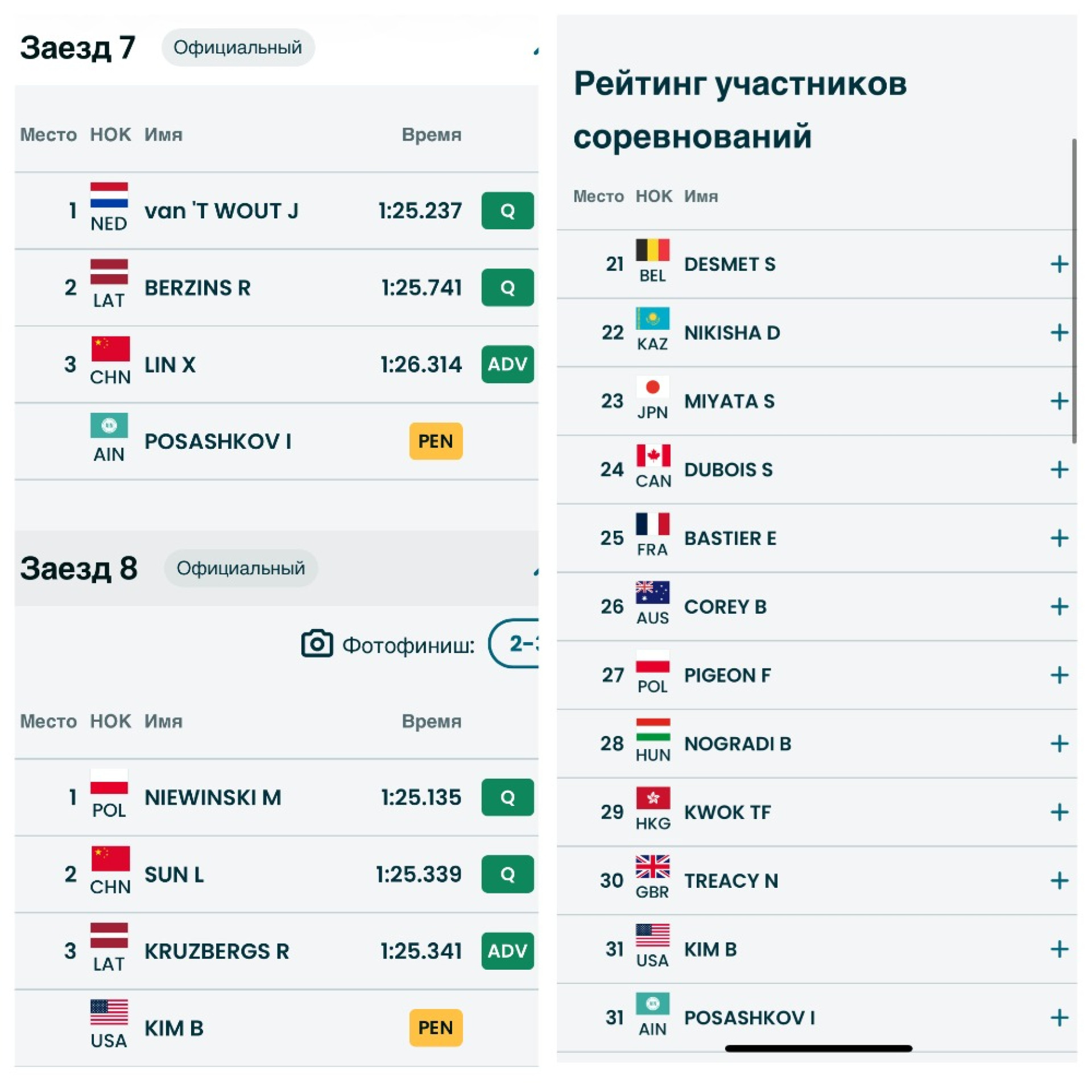 Похожая ситуация произошла и в последнем забеге: третий участник из Латвии финишировал быстрее казахстанца, но судьи долго определяли, было ли его замедление причиной для дисквалификации. В итоге арбитры встали на сторону латыша.