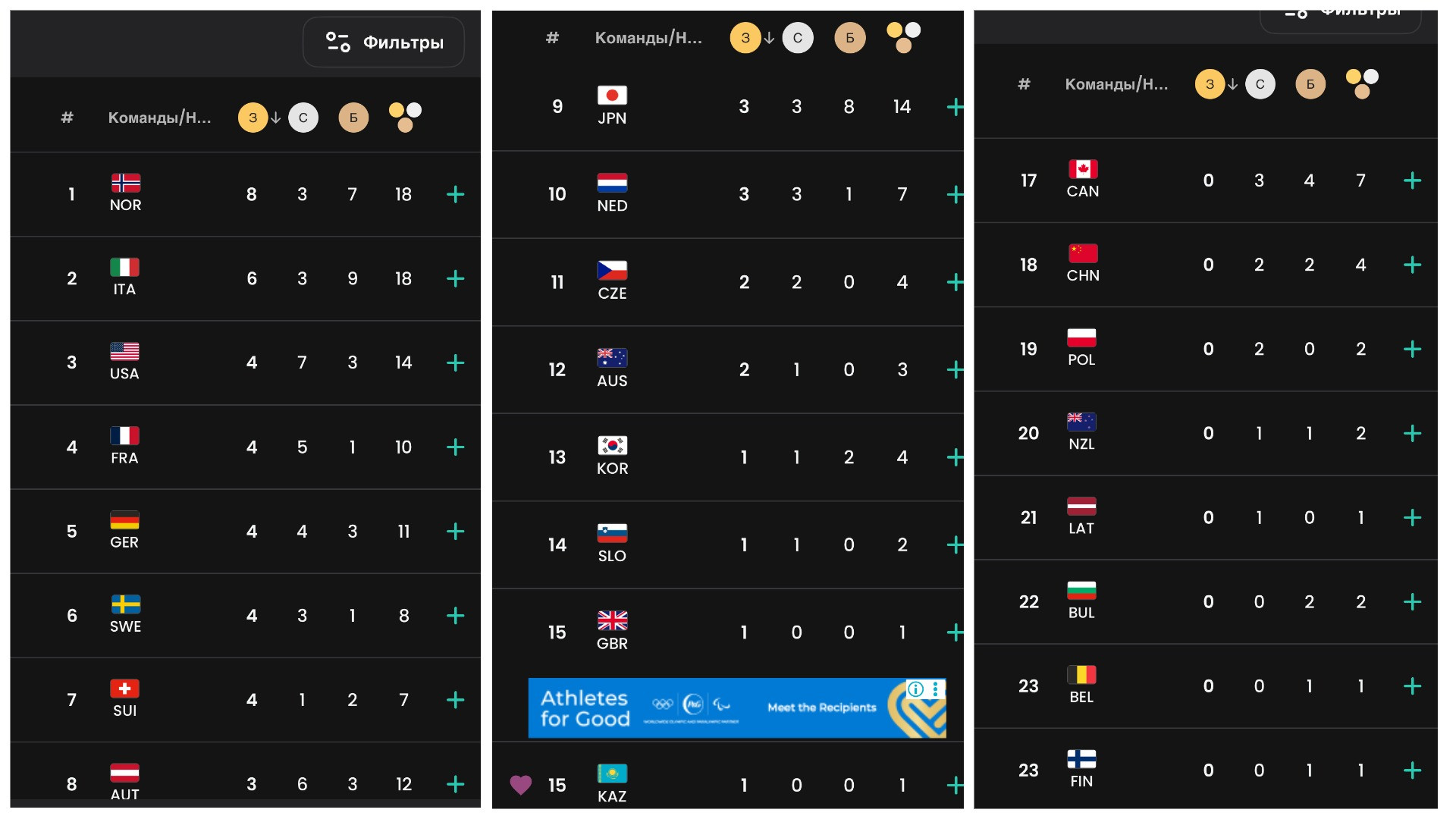 Отметим, что в медальном зачете приоритет отдается золотым медалям. Несмотря на то, что награда Шайдорова пока единственная для Казахстана на Играх 2026 года, команда поднялась выше тех, у кого в Италии уже четыре и даже семь наград.
