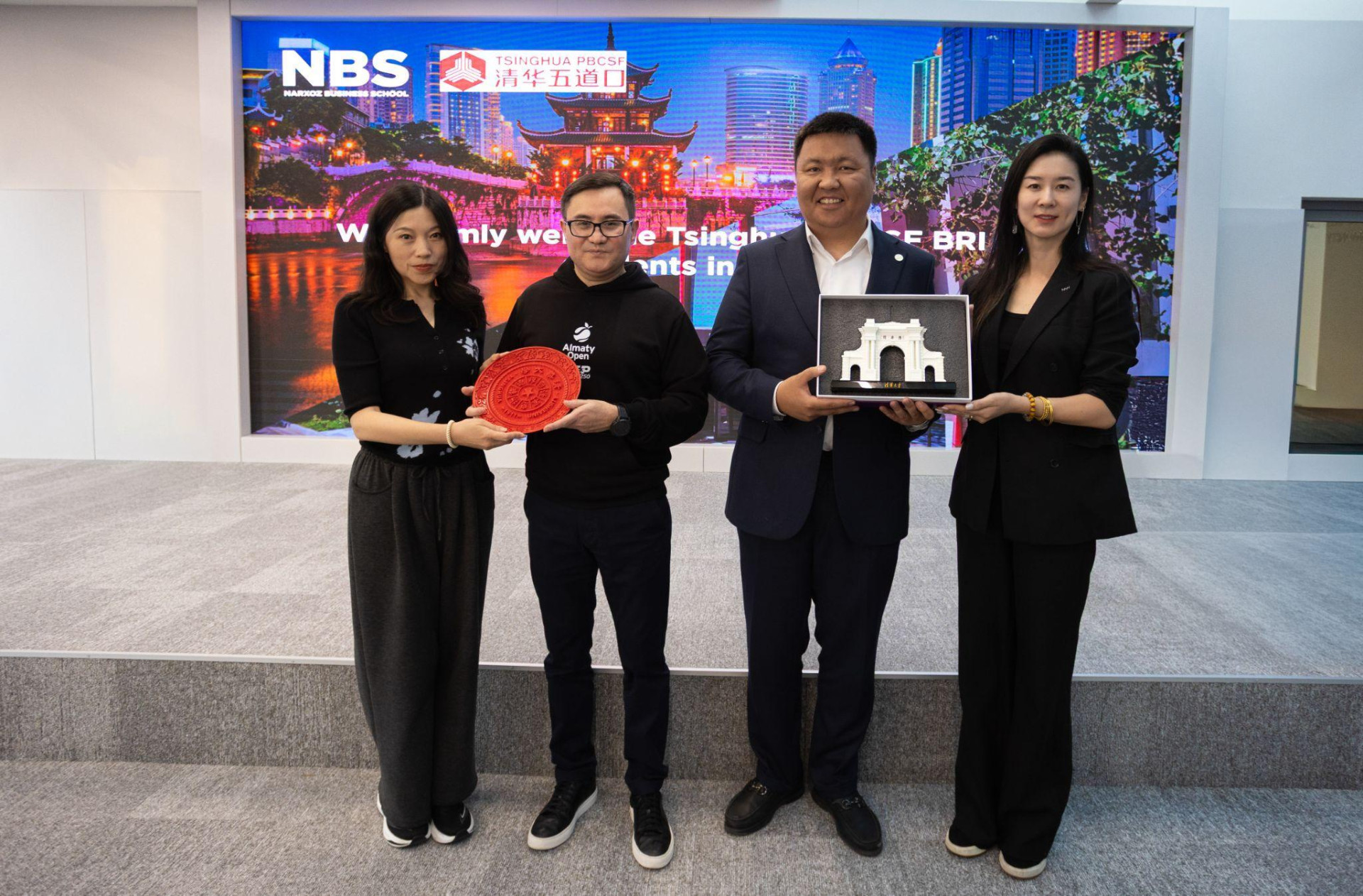 Представители программы Tsinghua EMBA вручают памятные сувениры президенту Университета Нархоз Қанату Қожахмету и заместителю генерального директора и финансовому директору группы компаний "Верный Капитал" Данияру Турсункулову.